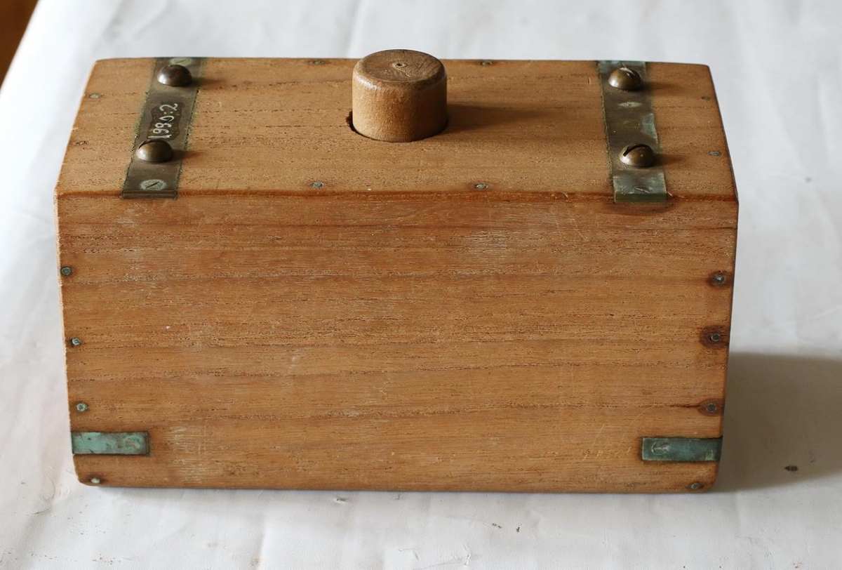 Smjörmælir úr furu, negldur saman með koparnöglum. Koparskífur eru til styrktar á hornum. Hann stendur á koparnöglum sem skrúfaðir eru í gegnum koparskífu upp í gegnum botninn og ná u.þ.b. 1 cm upp úr botninum að innan. Hausar naglanna mynda fætur (fjóra fætur). Mál mælisins er 20 cm langur, 9,5 cm breiður og 10,6 cm hár. Innanmál er 18 x 7,6 cm. Dýptin er u.þ.b. 8,5 cm. Pressan sem gengur niður í mælinn er 17,9 cm löng, 7,3 cm breið og 1 cm á þykkt. Handfangið er 10,3 cm hátt og 2,5 cm í þvermál. Sett í pressuna í gat á henni. Það gengur ofan í hana um gatið sem er 1,5 cm í þvermál.