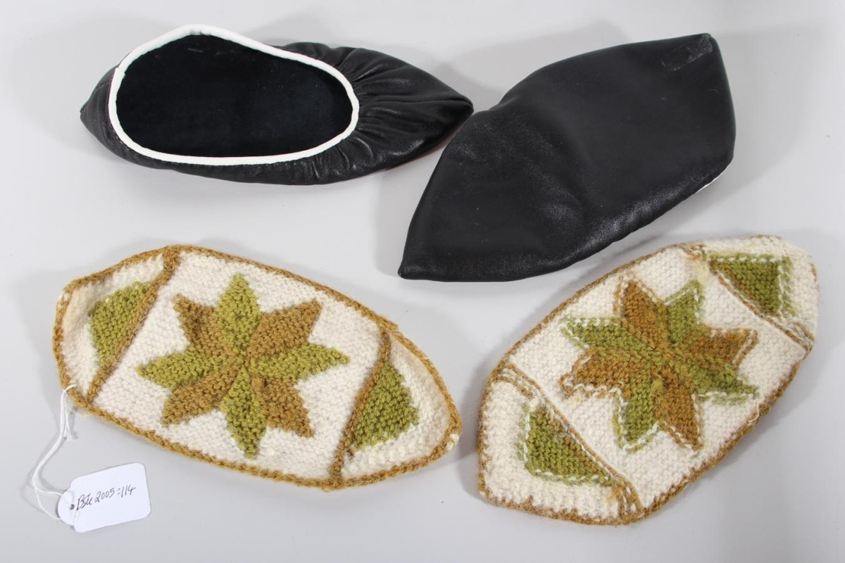 Sauðskinnsskór úr svörtu lambskinni með hvítri bryddingu úr eltiskinni. Saumaðir á hæl og tá og bryddingu með svörtum hörtvinna. 23 x 11 cm að stærð. Í skónum eru illeppar prjónaðir með garðaprjóni. Aðallitur hvítur. Í miðju er græn (tvílit) áttblaðarós og grænt oddamunstur er á tá og hæl. Saumaðir að utan með brún með kontórsting með grænum lit.