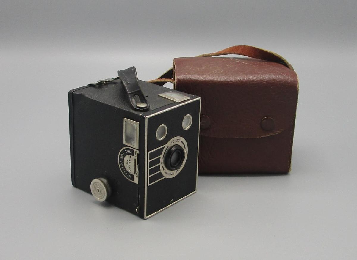 Kassamyndavél af gamalli gerð, þar sem maður horfir niður í vélina. Í tilheyrandi tösku. brúnni. Tegundin er: Brownie senior six-20. Made in Ct. Britain by Kodak Ltd.