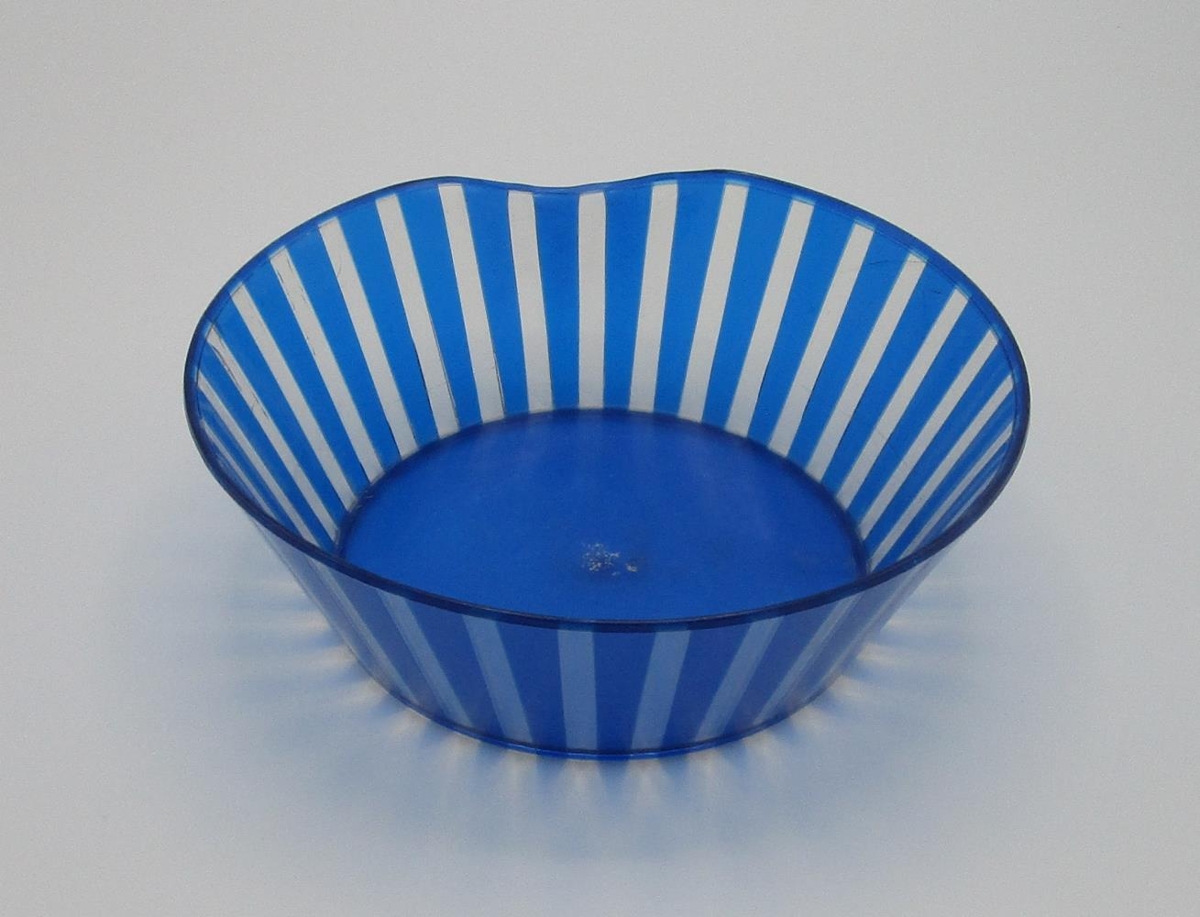 Plastskál, glær og blá röndótt, barmur á einum stað hefur sviðnað. Úr búi Jóns Péturssonar og Rósu (Sigurrósar Sigtryggsdóttur), Lindarbrekku, Búðardal. Þau bjuggu í Búðardal frá 1959 - 1998.