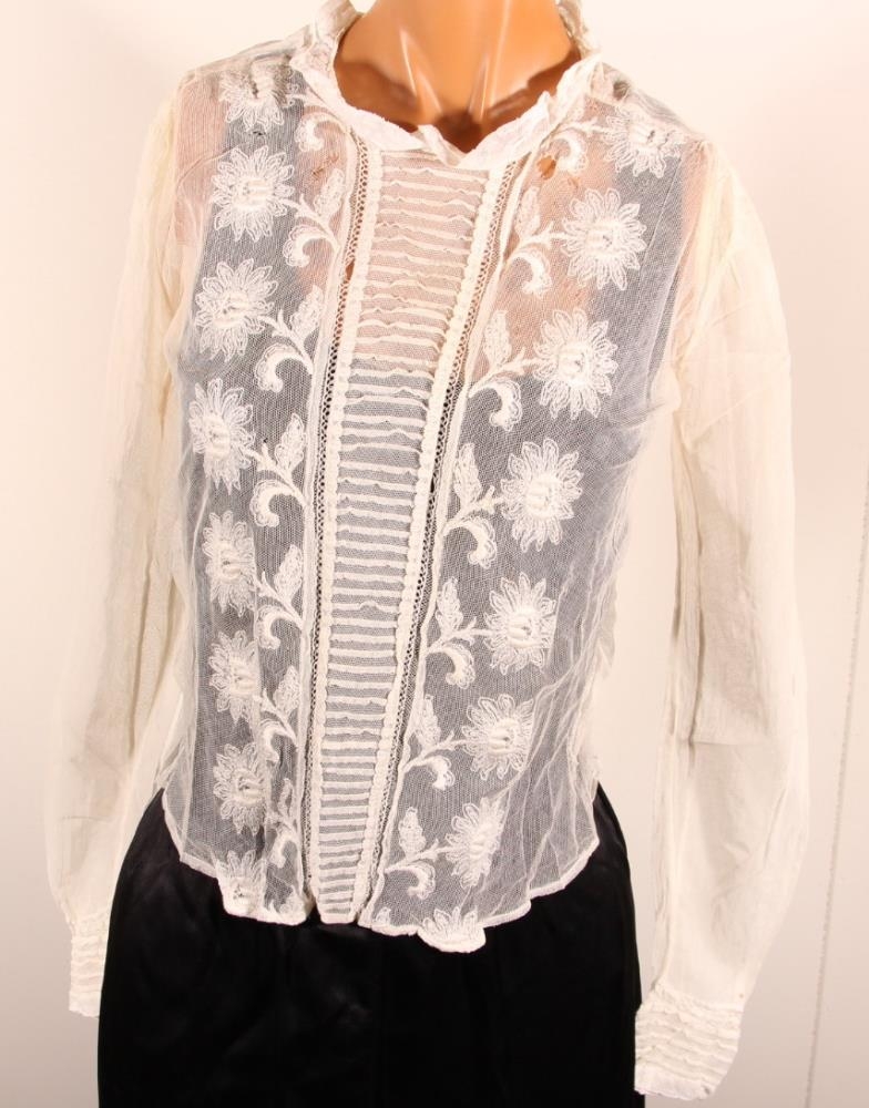 Blússa úr netofnu efni, öll útsaumuð að framan. Blúnda gengur niður mitt framstykkið og er á líningum og um háls, einnig að aftan þar sem blússunni er smellt og hneppt saman. Hún er aðeins tekin saman í mittið að aftan og er síðari að framan. Mjög fín. Brjóstmál þ.e.a.s. um handveg er um 45 cm, svo ummálið er 90 cm. Ermalengd frá axlasaumi og fremst á líningu er 68 cm.