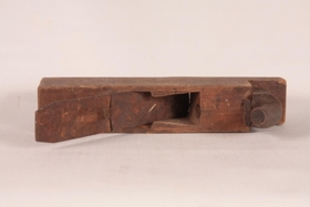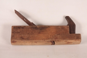 Hefill/falshefill/bandhefill úr brenni, 22 x 4 x 6 cm. Til styrktar járninu sem er íhvolft hefur verið smeygt hurðajárni með stóru lyklagati. Handfangið er úr dekkra efni, brenni eða brúnbrís.