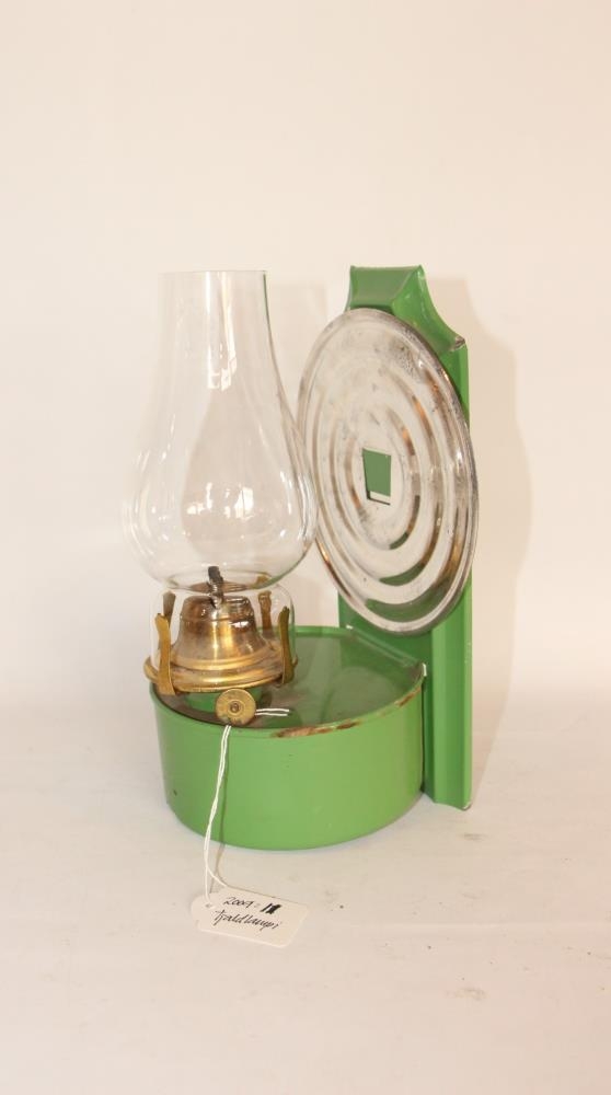 Tjaldlampi úr blikki og gleri, litur er grænn. Hæð alls 24,5 cm. Tankurinn er 5,4 cm á hæð og 14,5 cm í þvermál. Á upphenginu er þvermál 14,5 cm kringlótt járnlitað ,,lok" sem endurkastar ljósinu. Glerið er merkt: GRIFFIN - BRAND EIREPROFF forein. Flatbrennari, í fullkomnu lagi.