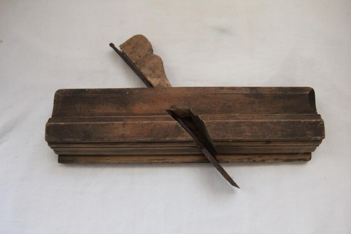 Strikhefill úr eik. 25,3 x 7 x 3,8 cm að stærð. Fleygur úr furu (kanafjöl) er spýttur með skurðajárninu. Á báðum endum eru fínt brennimerktir stafirnir SJ.