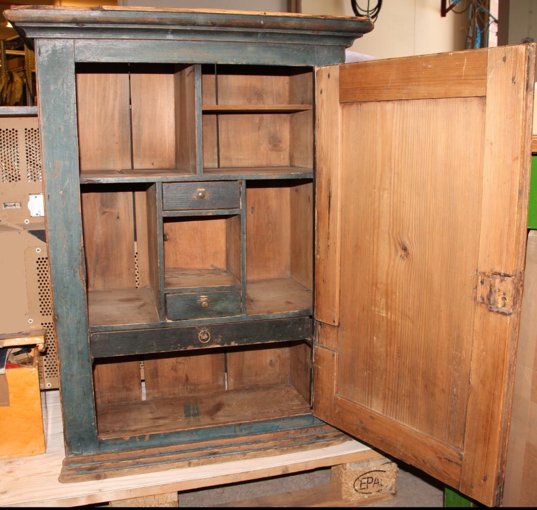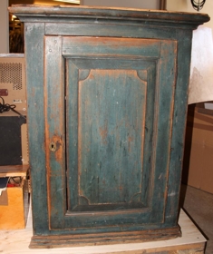 Skápur úr furu, blámálaður fornlegur, afmáður og lakkaður á hornunum. Hefur verið góður gripur í upphafi. Stærð 62 x 33,5 cm. Pallur ofan á er stærri um sig eða 72 x 38 cm. Hæðin er 94,5 cm. Frá Páli Óskarssyni á Sauðárkróki. Er úr búi ömmu hans og afa.