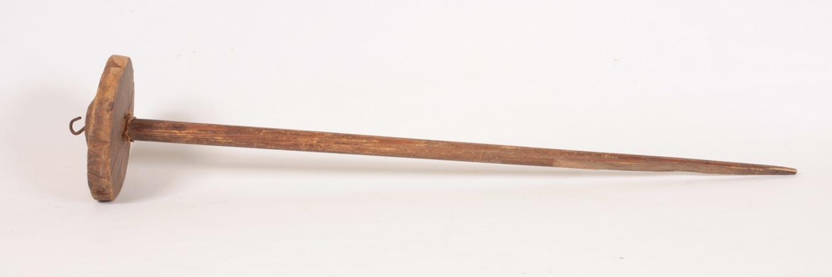 Snælda (f. hrosshár) úr furu. Þykkt 2,5 - 2,8 cm. Lengd 56 cm og þv. 12 cm. Járnkrókur er ofan á snældunni sem gengur í gegn um smiðinn. Á smið eru sex raufar. Endi snældunnar er brotinn.