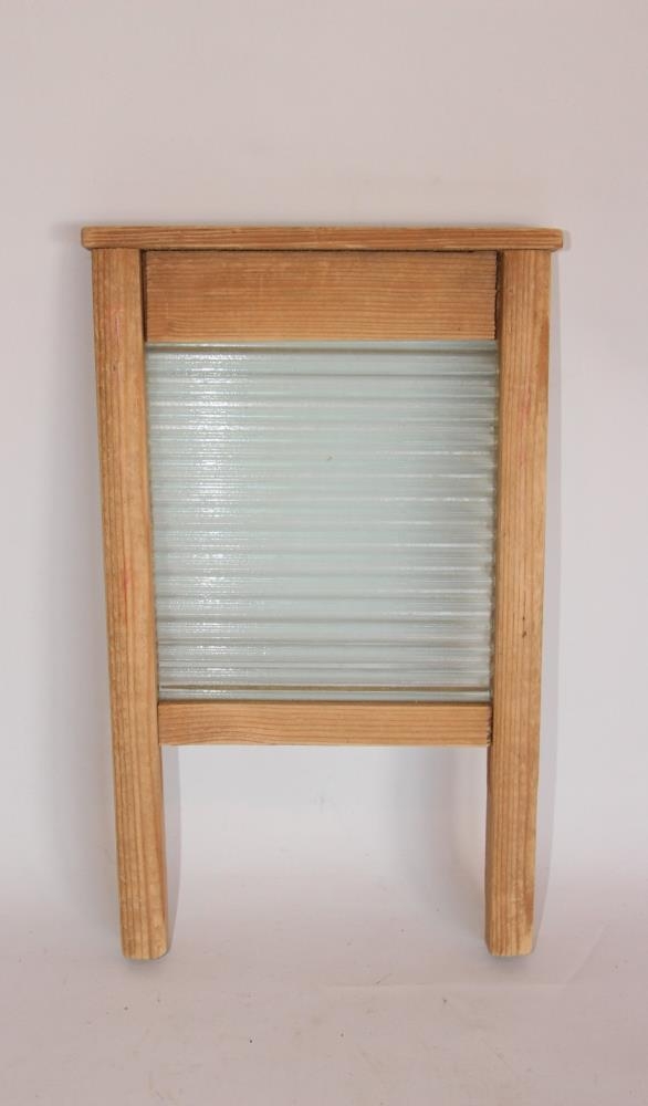 Þvottabretti úr furu. Stærð 28,8 x 17,2 cm. Brettið sjálft er úr gleri. Barnaleikfang.