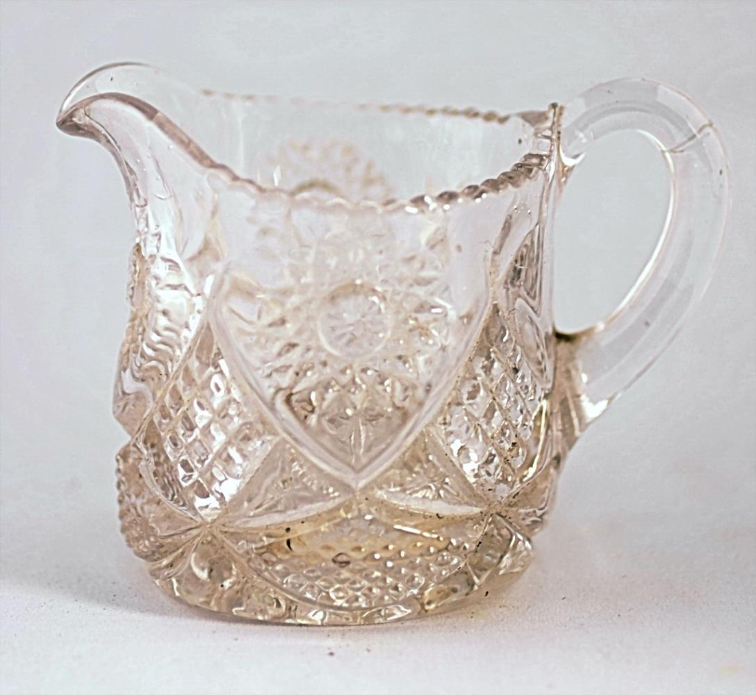 Glerkanna, hæð 24,7 cm og þvermálið er 14,8 cm. Belgvíð með stút á brún og hlífum yfir. Eyrað er vítt. Úr glæru gleri.