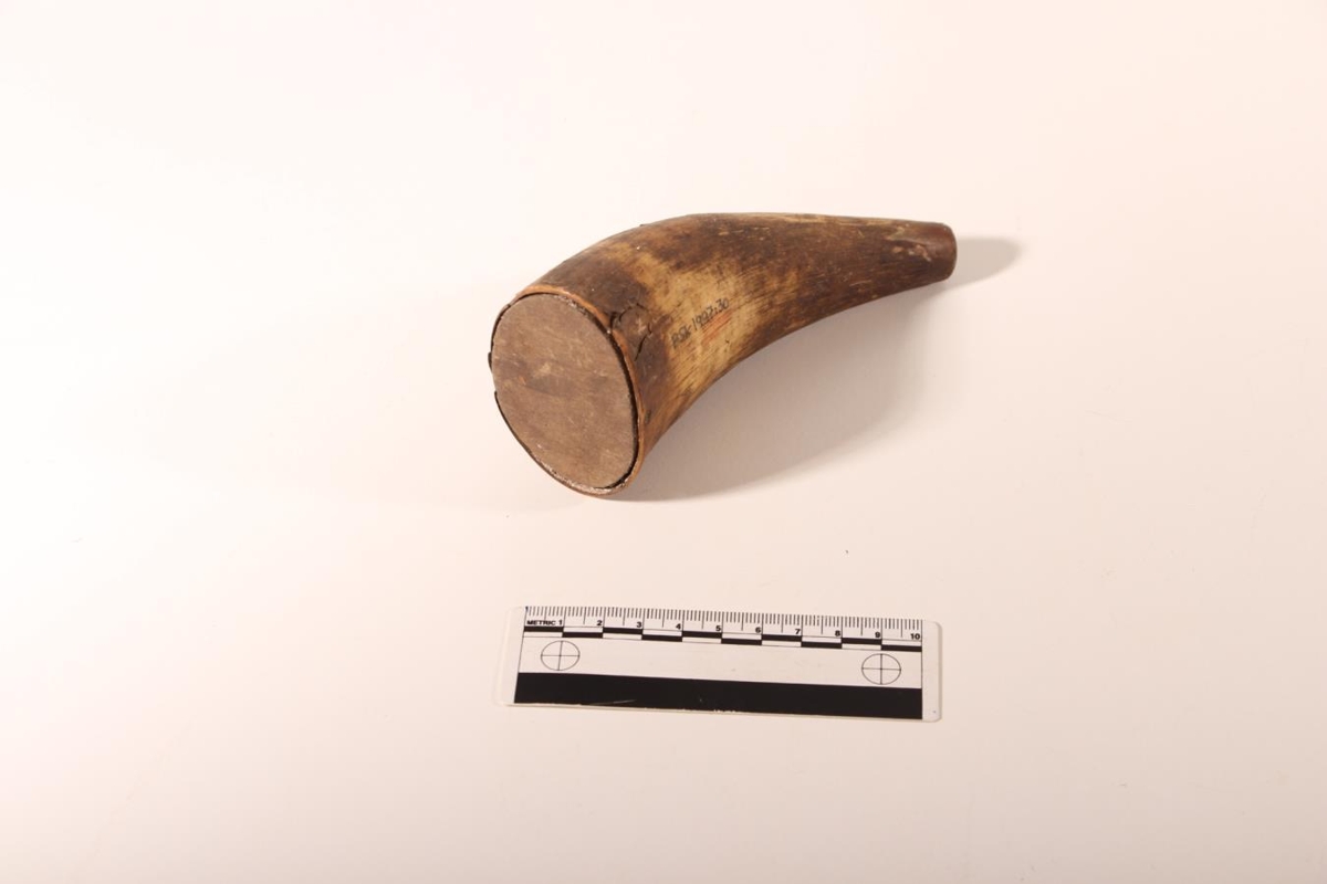 Púðurhorn (kýrhorn), botninn er úr tréplötu. Tappann vantar.