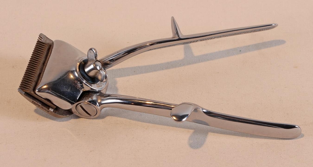 Hárskeri úr járni. Mesta lengd 17 cm. Þvermál á haus 5 cm. Tvö eyru eru á skeranum á sitt hvoru haldinu, mislöng. Þegar haldið er dregið saman færist skerinn til á hausnum að framan og sker hárið.
