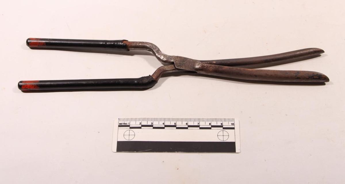 Lokkajárn úr járni, með svörtum gúmmísmokkum á handföngunum. Lengd alls 28 cm. Tveir tangar mynda sívaling og skúffu- eða rennulaga form sem sívalningurinn fellur ofan í. Til að setja lokka og krullur í hár.