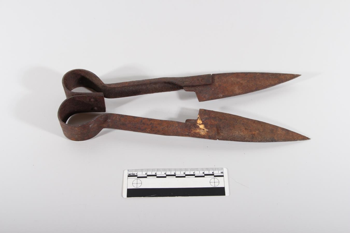 Fjárklippur úr járni. Lengd 27,9 cm. Blöðin eru hnoðuð á haldið.