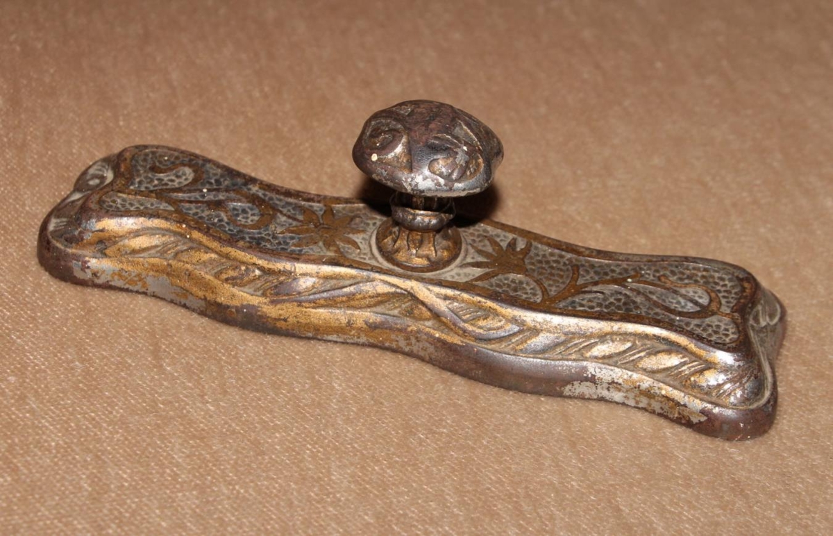 Bréfapressa úr járni, þung, 18,5 x 5 x 1,8 cm. Hefur verið gyllt og silfurlit, en litur mjög afmáður, á henni miðri er hald eða hnappur 3,7 cm hár. Ofan á er blómsturmynstur.