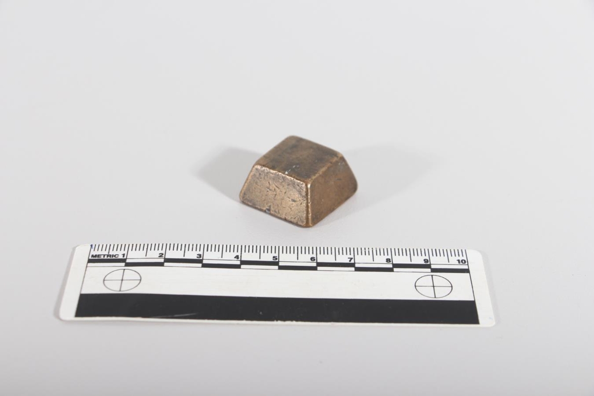 Lóð úr kopar, trapisulaga, breidd 1,7 x 2,5 cm. Merkt Christjáni V. 4 L - 4 pund. Frá Kristjáni Þ. Blöndal. Gefandi er Árni Blöndal.