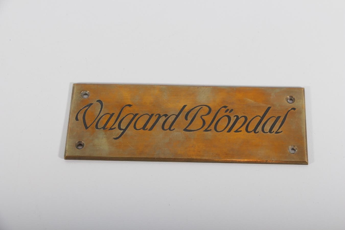 Nafnskjöldur úr kopar, hurðaskilti. Þunnt, 13,5 x 5 cm. Borað á öllum hornum. Á stendur Valgarð Blöndal (1902-1965) sem var sparisjóðsstjóri á Sauðárkróki. Gefandi er Árni Blöndal á Sauðárkróki.
