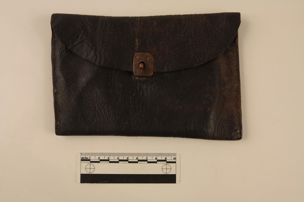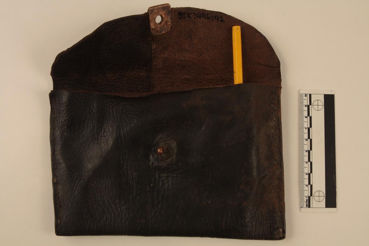 Seðlaveski úr dökkbrúnu (svörtu) leðri. Þriggja hólfa með umslagslagi. Heimasaumað. Lokað með koparkrækju. Koparskífan er hnoðuð á. Laglegt veski en stórt utan um gömlu seðlana.