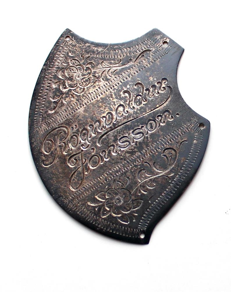 Kápuskjöldur úr silfri. Lauflaga. Mjög þunnur og nettur. Nafn Rögnvaldar Jónssonar er grafið í skjöldinn og tvær rósir fyrir ofan og neðan nafnið. Fjögur göt eru á skildinum til festingar í kápuna. Það þótti mjög fínt að vera með skjöld í kápunni hér áður fyrr, gæti verið frá um 1950.