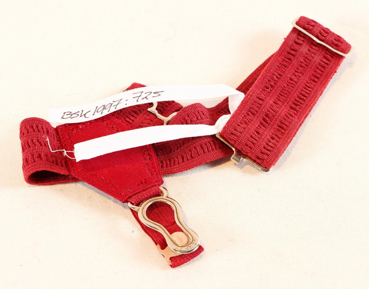 Sokkaband úr rauðri bómull, teygja. Teygjan utan um fótinn er lengjanleg, en er um 32 cm. Á henni er krókur öðru megin og lykkja hinu megin. Bandinu er krækt utan um fótinn neðan við hné og hneppsla gengur niður úr því til að hneppa á sokkinn. Hneppsla og krókar eru úr járni. Sokkabandið var í eigu Jóns Nikódemussonar, vélsmiðs á Sauðárkróki og mun hann hafa notað það síðast í kringum 1960. Fatamerki með stöfunum J og S fylgdu með.