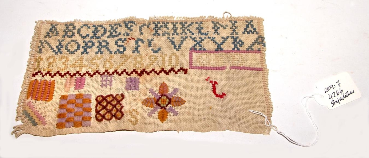 Allir stafirnir eru saumaðir með krossaumi. Og brún lína, sikk sakk, undir. Undir henni eru ýmsar saumgerðir. Með brúnu og bleiku, gulu og grænu og rautt, öfugt j, en hægra megin við saumadæmin. Undir þeim er S krosssaumað.