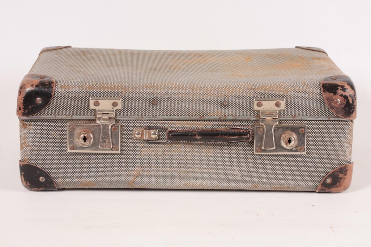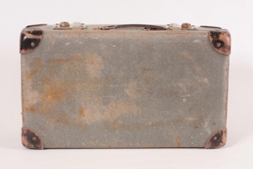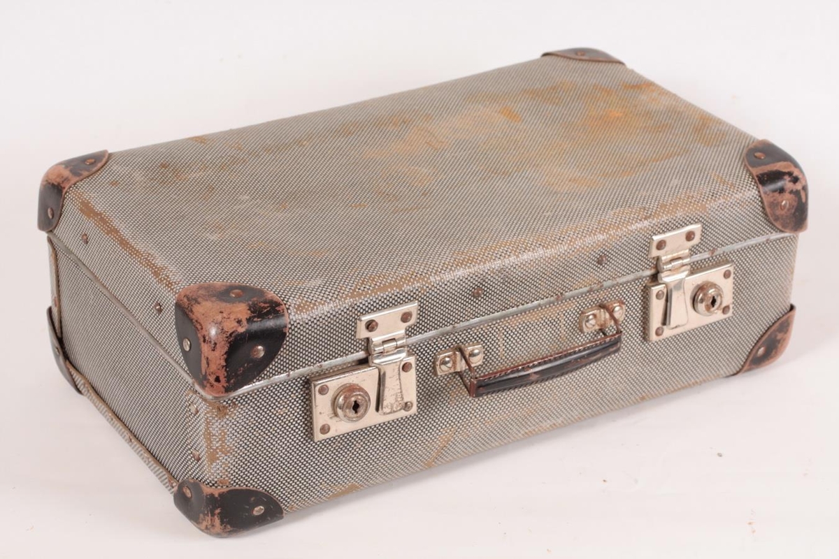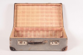 Ferðataska, árgerð 1950, úr pappa og járni. Leðurbætur á öllum hornum. Grá að lit. Haldið er úr járni og læsingar einnig. Gefandi er Hjalti Pálsson, Sauðárkróki.