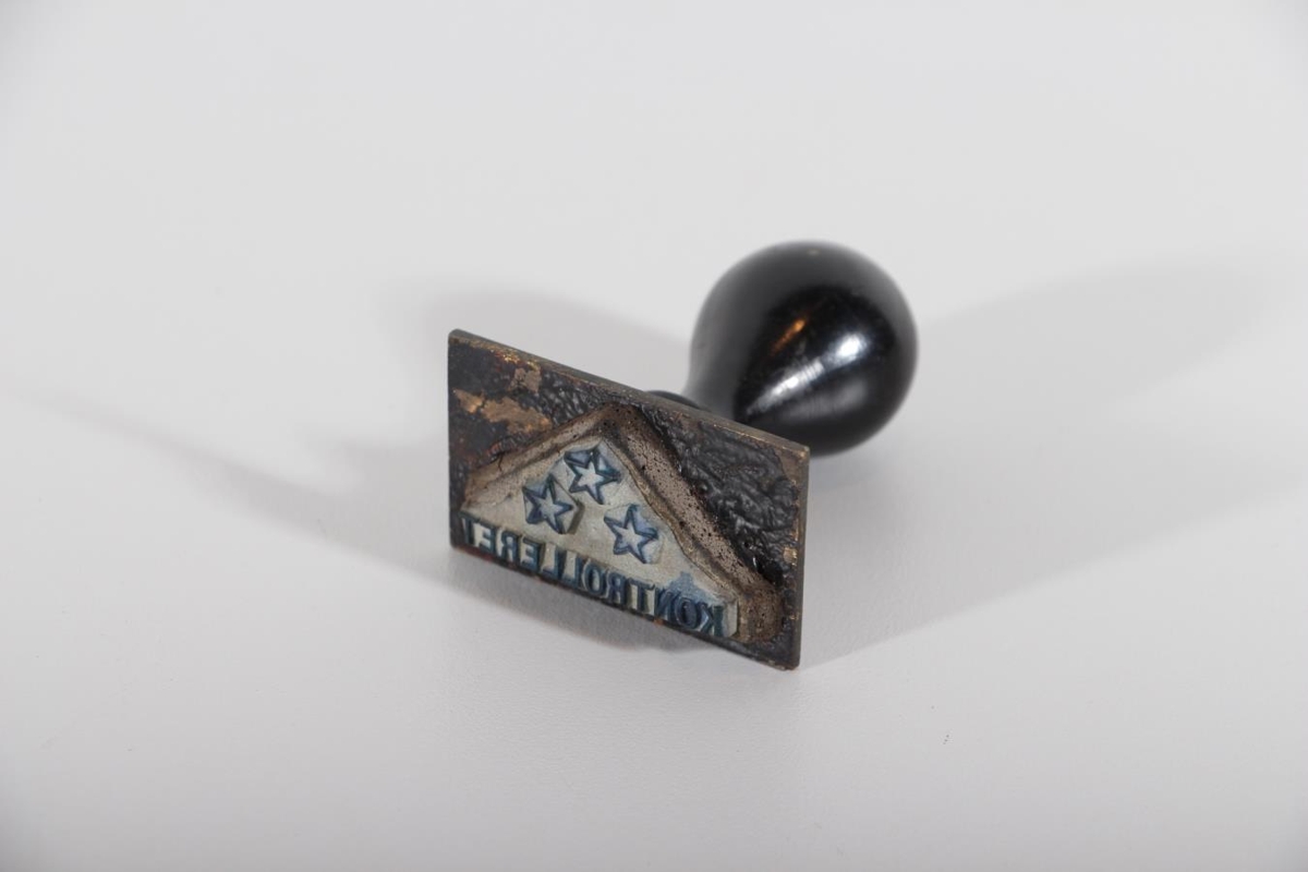Útflutningskontórstimpill, þriggja stjörnu. Stéttin er 5,5 x 3,5 cm úr messingþynnu, á hana er stimpillinn bræddur. Hann er úr gúmmíi. Á honum eru 3 stjörnur og KONTROLLERET. Haldið er 6 cm hátt úr svörtu íbenholti. Úr eigu J. Valgarð Blöndal sparisjóðsformanns og flugumferðarstjóra á Sauðárkróki. Gefandi er sonur hans Árni Blöndal.
