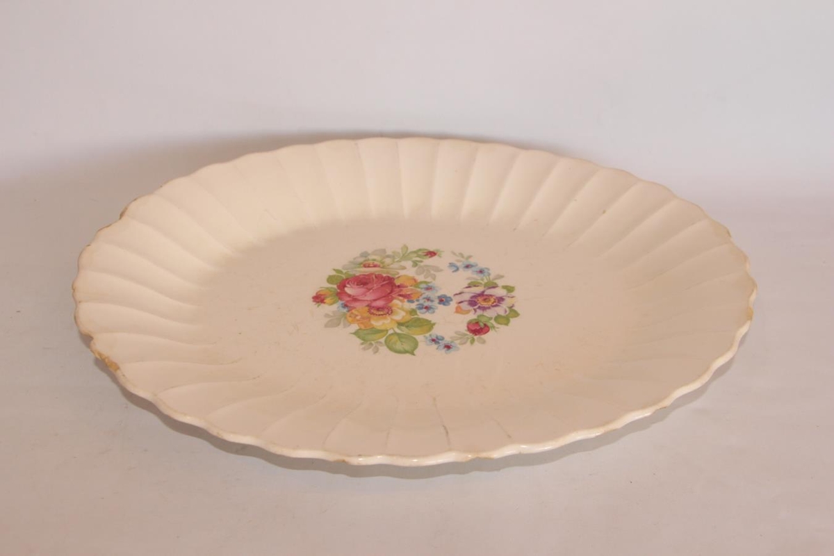 Fat, leirfat, hvítt með rósamynstri í botni: rauðar, gular, ljósbláar, bláar, með grænum blöðum og gráum. Barmar fatsins eru ,,bylgjaðir". Stærð 39 x 32 cm, sporöskjulaga. Notað undir soðning. Kjöt, fisk og fleira.