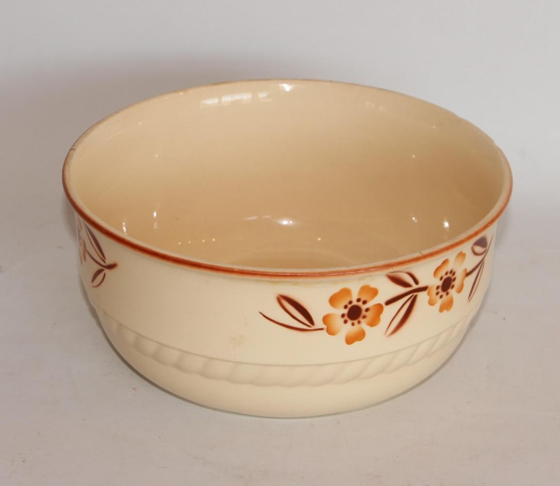 Leirskál, hvít að lit með brúnum og gulbrúnu blómamynstri á þremur stöðum. Brún á brúnum. Hæð 10,7 cm, þvermál 23,3 cm. Kvarnað úr brúnum á tveim stöðum. Annars óskemmd. Ógreinilegur brúnn stimpill er neðan á skálinni og í leirinn, fyrir glerjun hefur verið stimplað 552/2.