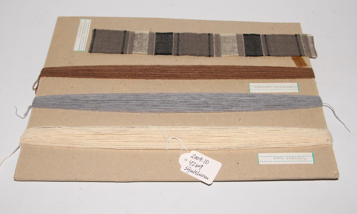 Ullarband og vefnaðarsýnishorn. Ullarbandið er í þrem litum, hvítt, fjórþrætt band og grátt og mórautt tvinnað band. Mórauða bandið var t.d. notað í fingravettlingana nr. 4267. Vefnaðarsýnishornið er úr mjög fínspunnu ullarbandi í svörtum, hvítum og grámórauðum lit. Sama efni og er í svuntunni nr. 4268.