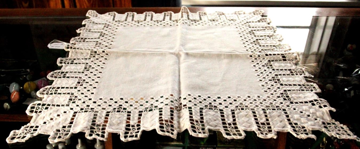 Hvítur harðangursaumaður borðdúkur úr bómull, saumaður með hvítu bómullarbandi. Stærð 49 x 50 cm.
