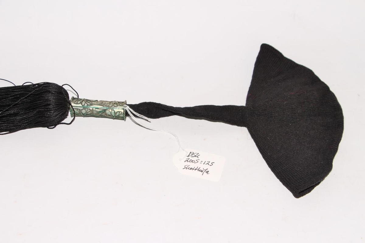 Skotthúfa, prjónuð úr fínu svörtu ullargarni. Hringlaga um 16 cm í þvermál, með prjónuðu 12 cm löngu skotti sem á er festur 40 cm langur silkiskúfur. Á samskeytum skúfs (sem klæddur er svörtum bómullardúk, um 7 cm löngum) og skotts er silfurhólkur. Silfurhólkurinn er 5 cm langur og 1,6 cm í þvermál. Hann er skreyttur að utan með víravirkisblómum, laufum og snúrum á sitthvorum enda. Stimplar eru sjáanlegir. Óvíst hvaðan hún kom.