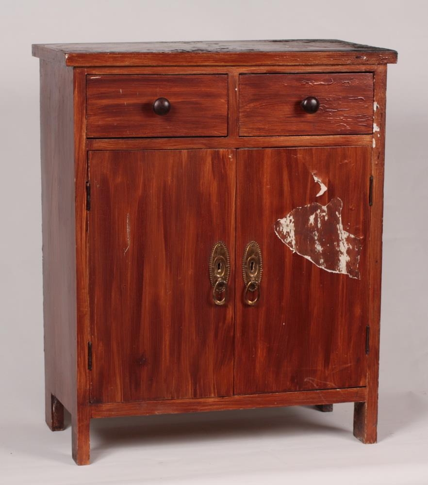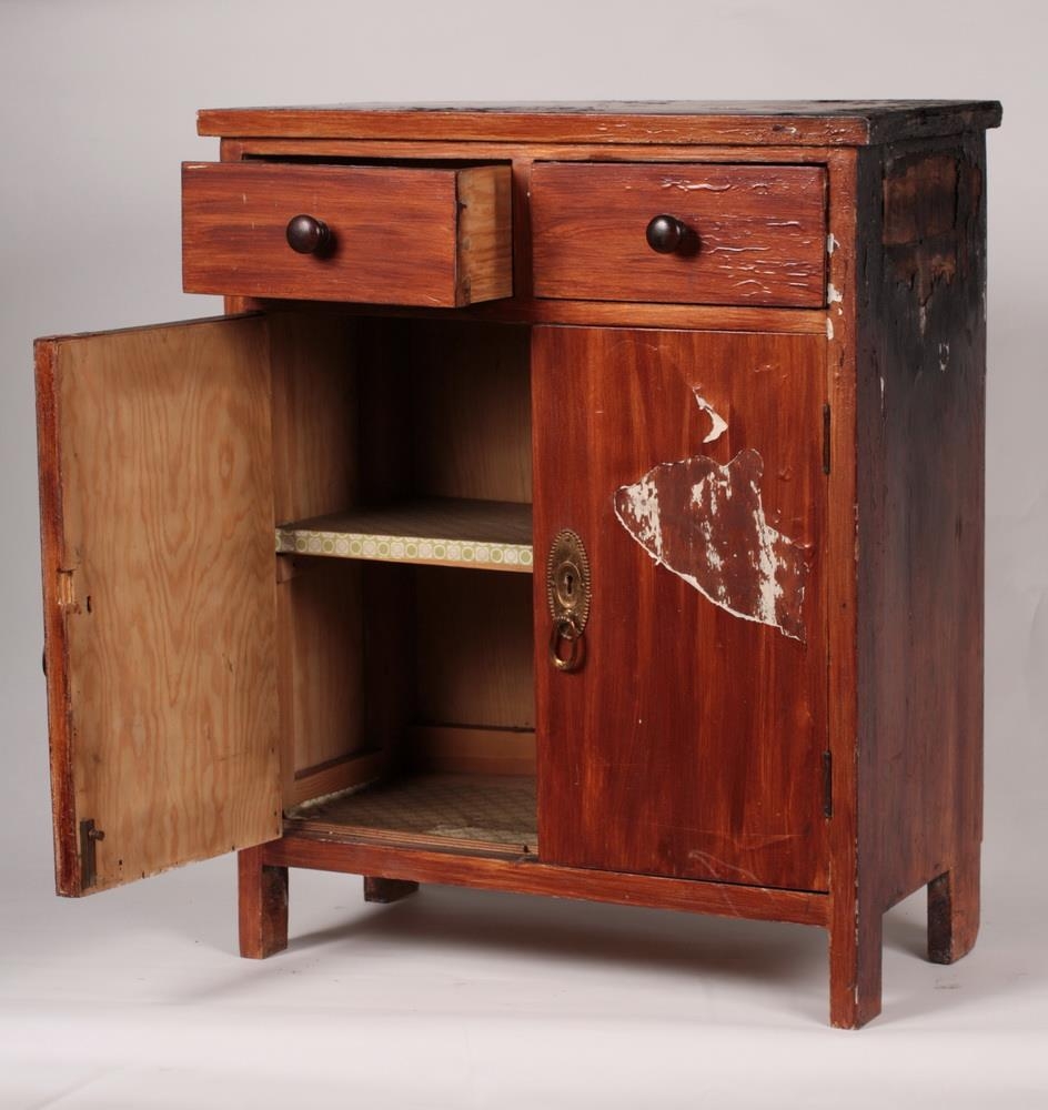 Skápur úr furu, bak úr krossviði. Einföld smíð. Brúnmálaður. Hæð 69 cm, breidd 57 cm, dýpt 29 cm. Tvær skúffur eru efst, dregnar út með dökkbrúnum eikarhnúðum, skápar eru undir með einni hillu, og eru málmskífur um skráargöt og á þeim lykkjur til að opna skápana.