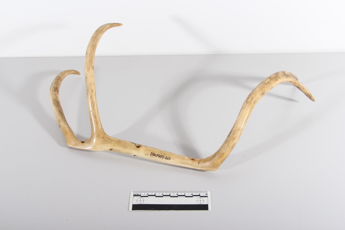 Fatasnagi úr hreindýrshorni með 3 álmum, mesta lengd 43 cm. Breidd fram um 20,5 cm. Skrúfað á vegginn á fjöl sem klædd var rauðu plussi (fjölin fylgir ekki).