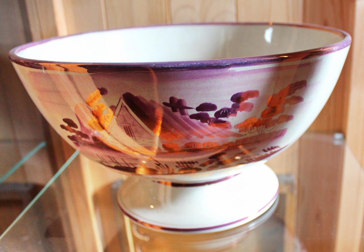 Myndskreytt í rauðbrúnum kopargylltum litum - hús og kirkja í skógi við vatn, með fleiru. Eru þrjár samstæðar myndir að utanverðu, og ein að innan, á botni, með sömu tilbrigðum. Verksmiðjunafn: "SEWELL 3".