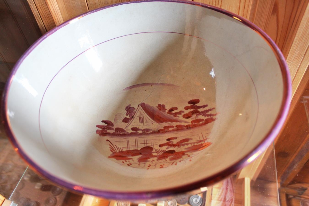 Leirskál, gulhvít að lit. Þvermál að ofan 28 cm, hæð 15 cm. Stétt að neðan 16 cm í þvermál og hæð hennar 5 cm. Á skálinni eru gylltar rendur á börmum að utan og innan og á stéttinni. Þrír gyllingarhringir, og einn hringur um miðja skálina að innan.