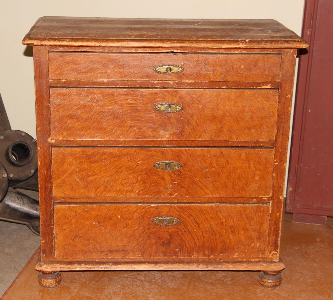 Kommóða, oðruð, sennilega úr furu, viðarmáluð. Hæð 91 cm, lengd 91 cm og breidd 46,5 cm. Fjórar skúffur, sú efsta minni en hinar. Renndir 9 cm háir kúlulaga fætur undir kommóðunni að framan en kubbar að aftan. Á skúffunum eru skrautskildir utan um skráargötin, 10 cm langir og 3 cm breiðir, úr kopar eða messing, sporöskjulaga með skrauti á köntunum.