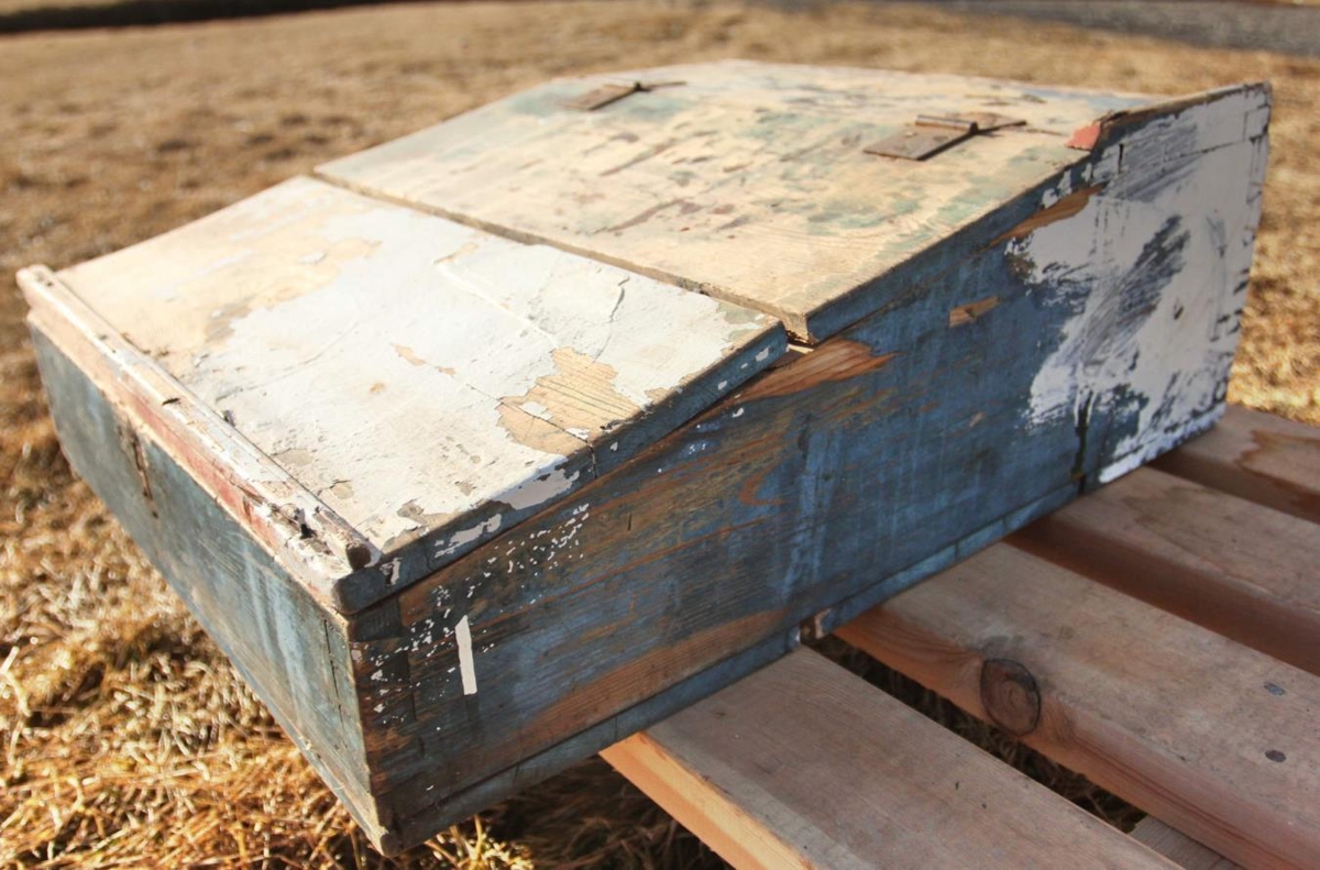 Skrifpúlt úr furu, einhvern tímann hefur það verið blátt, grænt og rautt (listar) og hér og þar er hvít málning. Skúffa ofan í púltinu er rauð með þeim lit sem á því var fyrst. Fremur stórt. Listar eru nær allir farnir. Illa farið og illa hirt, slettótt af ýmsum ástæðum.
