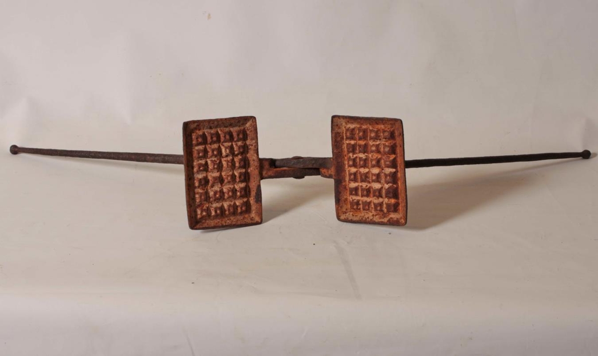 Vöfflujárn úr steyptu hlóðarjárni, 63 cm langt. Tangarhöldur um 58 cm. Sjálf járnin eru 9,5 x 13,5 cm. Járnin eru ævagömul og ræfilsleg, brestur er komin í tangarhald við sjálft járnið.