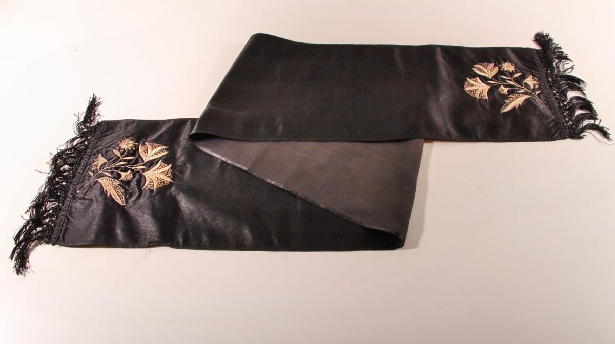 Slifsi, svart. Lengd með kögri 1,44 m og 23 cm breitt. Úr silki. Baldýrað á endunum, blómamynstur með silfurþræði og pallíettum. Una Jóhannesdóttir á Hofsstöðum saumaði það.