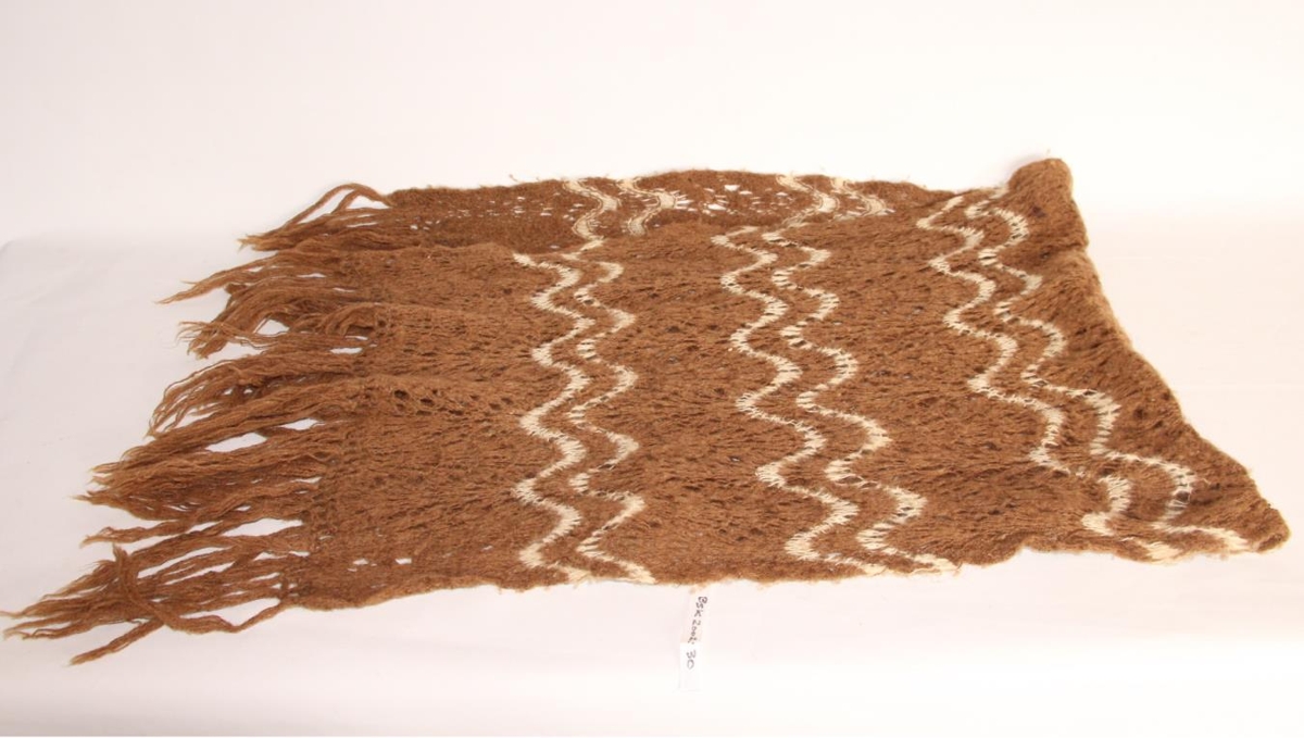 Trefill/Hálsklútur úr mórauðri og hvítri ull, prjónaður með munstri sem líkist hörpuskelsmunstri en er miklu lausara (gisnara) í sér. Lengd alls með kögri um 186 cm, breidd 50 cm. Aðallitur er mórauður og hvítar mjóar rendur sem bylgjast þversum.