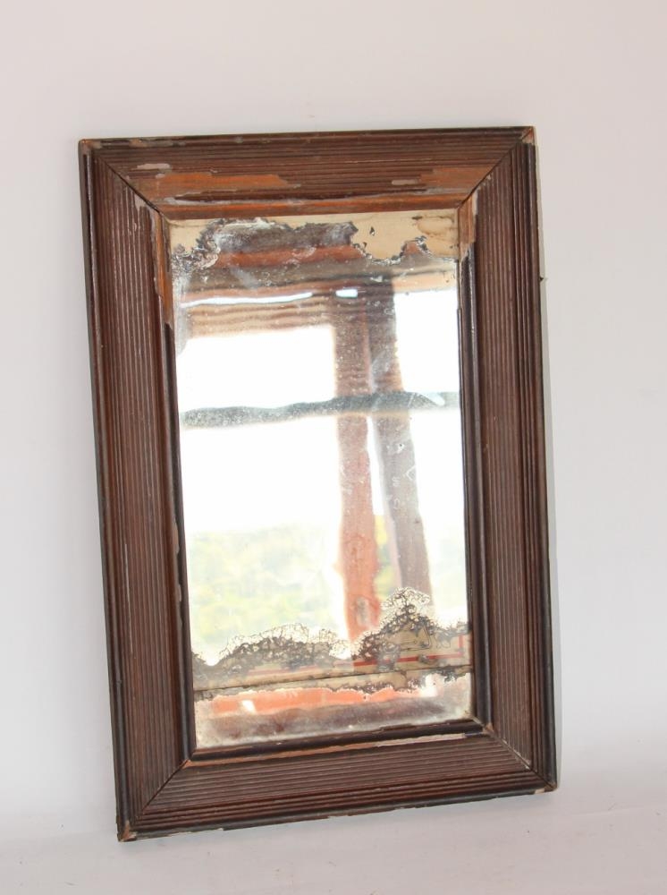 Spegill, illa farinn. Umgjörðin 4,5 cm breið, úr tré, máluð dökkbrún, málningin er rákótt. Stærð 38 x 25,3 cm. Spegillinn er orðinn ævagamall.