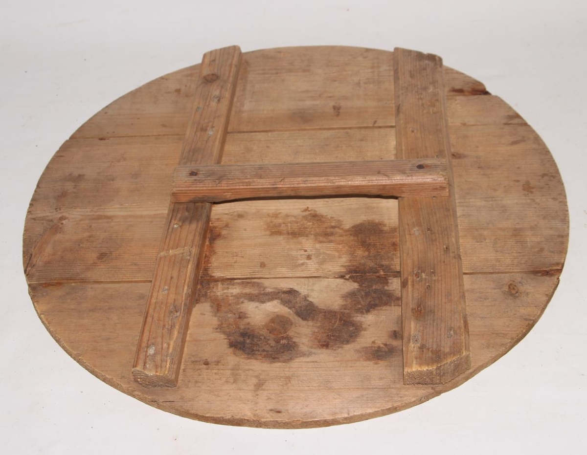 Hlemmur úr furu, af tunnu. Þv. 55,3 cm. 5 fjalir eru spengdar saman m. tveimur listum. Handfang, 20 cm langt, er sett á milli þeirra. Einföld smíð. Hlemmurinn er ofan af tunnu. Frá Elísabetu Andrésdóttur í Tungu í Gönguskörðum.