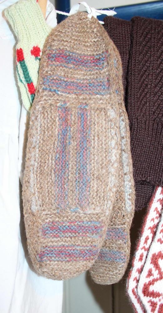 Skóleppar úr ull, lengd 28 cm, breidd um 9,5 cm. Prjónaðir með garðaprjóni úr tvíbanda garni. Aðal liturinn er mórauður með hvítu samtvinnuðu og rendur eru rauðbláar og bláhvítar. Rautt/blátt og blátt/hvítt tvinnað saman. Lepparnir, sem eru tveir (eitt par) eru prjónaðir í þrennu lagi og saumaðir saman á hæl og tá.