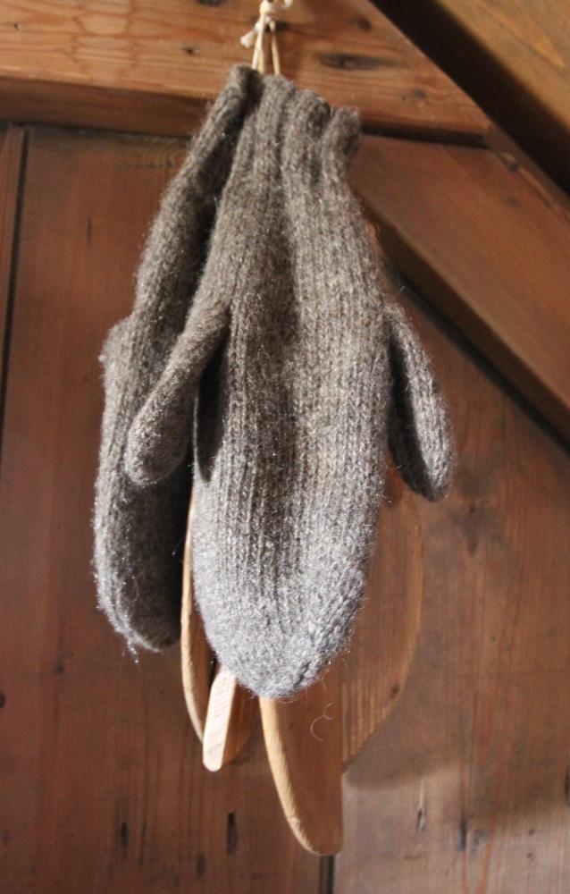 Tvíþumla belgvettlingar úr gráu ullarbandi. Stærð: 31 x 12,5 cm. Þumlalengd 8 cm, breidd um 5 cm. þegar lófinn slitnaði var vettlingnum snúið við og var þumlinum þeim sem laus var oftast brugðið inn í vettlinginn.