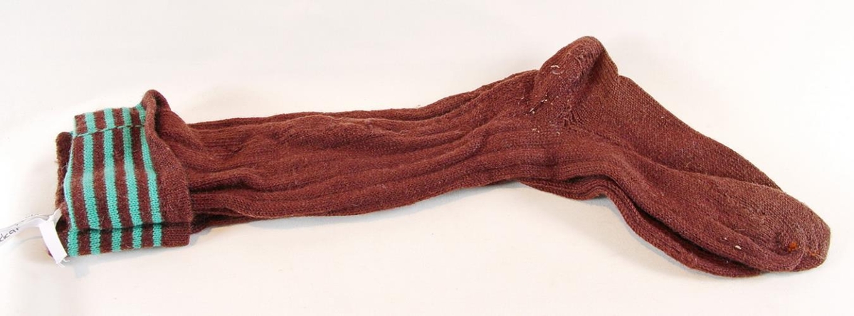 Reiðsokkar úr dökkbrúnu, lituðu ullarbandi með 5 grænum röndum efst á bekk sem felldur er niður á sokkinn eða utan yfir reiðstígvélin.