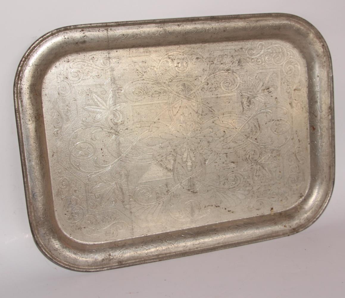 Bakki fyrir kaffi o.fl., silfurplett. Þungur. Allur símunstraður. Breidd 37,5 cm, lengd 50,5 og dýpt 2 cm.