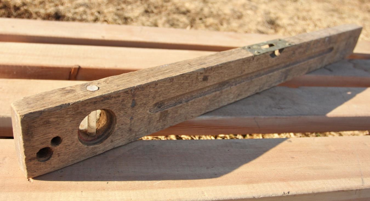 Hallamál úr furu, skornar eru raufar úr því svo auðveldara er að halda á því í notkun. Á öðrum endanum eru tvö lítil, misstór göt og við hlið þeirra er annað stærra. Hallamálið er 4,2 cm í þvermál, með gleri öðru megin og hallamálsglasi innan í.Á annarri langhliðinni er útskorið fyrir öðru glasi og þar er líka koparplata yfir til hlífðar. Notað við smíðavinnu og viðgerðir og til að rétta hluti af.