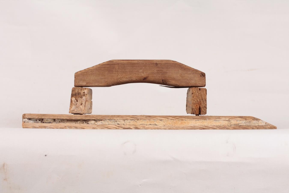 Múrskeið (pússbretti?/glattari?) úr furu. Stærð 36,2 x 8,7 cm. Heimasmíðað. Hæð á handfangi með plötu: 10,2 cm. Lengd á handfangi: 19 cm. Hæð frá plötu: 8,2 cm. Töluvert notuð greinilega og afgangsmúr í rauf á annarri langhliðinni. Af framendanum er skorin skái fram.