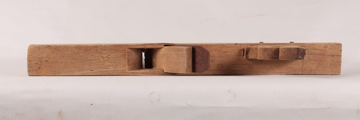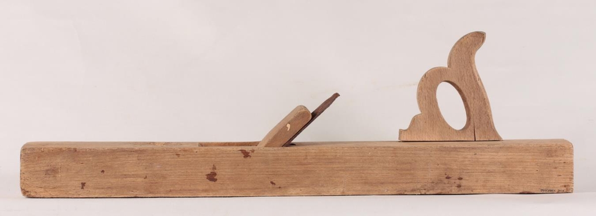 Langhefill úr furu. Stærð 61,7 x 6,2 x 5,7 cm. Járnið er 17 cm. Notaður til að hefla borðplötur og fleira. Haldið er glæsilega útskorið, stærð 12 x 24 x 12,6 cm. Haldið er fest með tveim trétöppum á annarri langhlið.