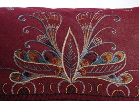 Púði úr ull. Vínrauður ullarjafi með ljósara lérefti í bakið. Saumað með mislöngum sporum og aftursting með ullarbandi, pastellitum, bláum, gráum, brúnum og bleikum. Púðinn er mikið notaður og sennilega verið setið á honum í stól einhvern tímann.