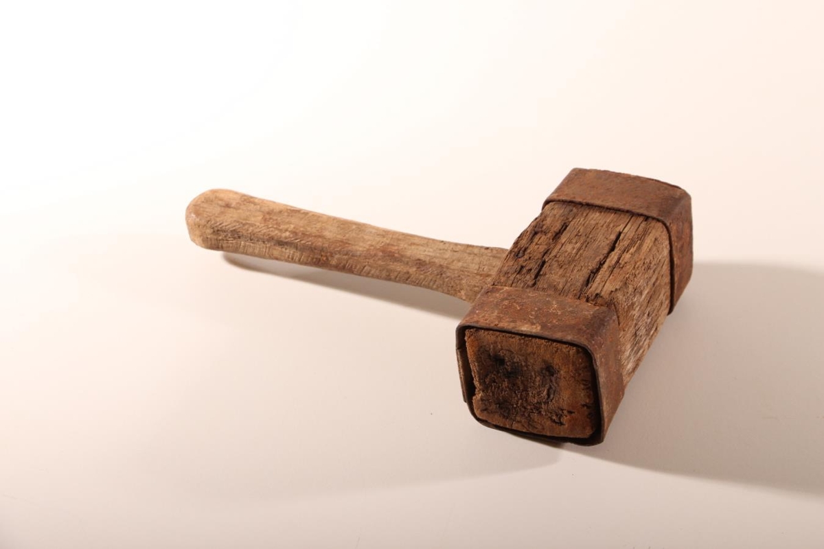 Smíðahnallur úr tré, járngirtur til endanna. Hausstærð 15 x 7 x 7 cm. Tréskaft 20 cm að lengd.